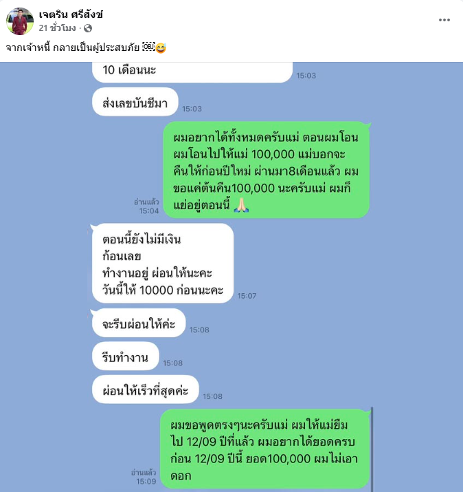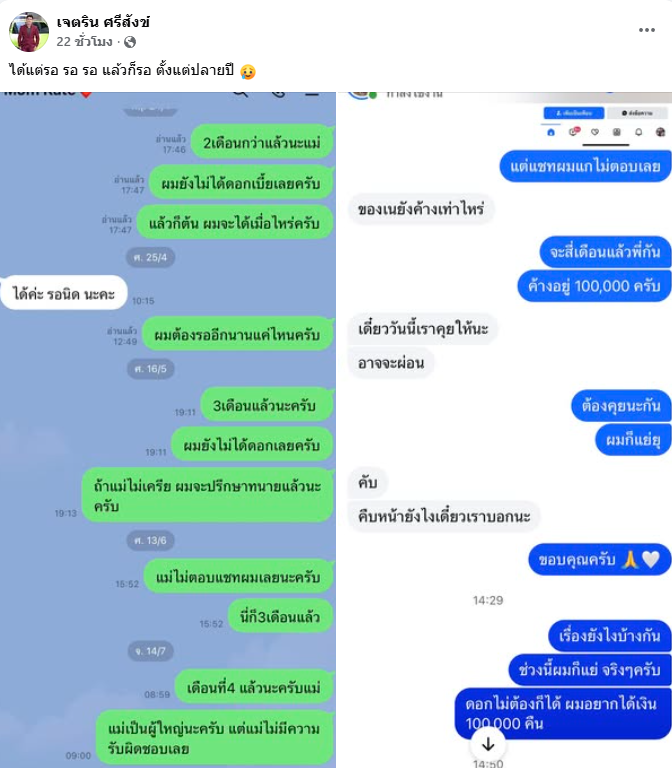 ซึ่งทางด้านชาวเน็ตได้พุ่งเป้าไปที่ “แม่เกตุ” แม่ของของสาว “เจนนี่ รัชนก” งานนี้ “เนเงิน” จึงออกมาไลฟ์สดโดยเผยถึงเรื่องราวนี้ว่า “เขาบอกจะคืนไม่เกินปีใหม่ นี่เดือน 8 แหละ พอทักไปก็เงียบไม่ตอบเลยเลือกที่จะโพสต์ เผยอยากได้เงินคืนเพราะผมก็แย่อยู่ สรุปคุยกันง่าย ๆ เลย วันที่ 20 ผมขอก่อน 3 หมื่น วันที่ 30 อีก 3 หมื่น ก่อนวันที่ 12 เดือนหน้าขออีก 4 หมื่น ทุกคนรอดูว่าผมจะได้ไหม ยอมรับว่าผมแย่มากจนต้องขายรถที่ผมรัก”