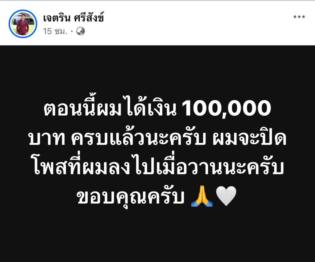 ส่วนทางด้าน “เนเงิน” ก็ออกมาโพสต์ข้อความว่า “ ตอนนี้ผมได้เงินครบ 100,000 บาทแล้วนะครับ ผมจะปิดโพสที่ลงไปเมื่อวาน นะครับ ขอบคุณครับ“