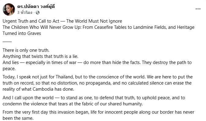 ล่าสุด “บุ๋ม” ได้โพสต์ข้อความยาวเป็นภาษาอังกฤษถึงสถานการณ์ชายแดนระหว่างไทย-กัมพูชา เพื่อสื่อสารกับชาวโลกให้รับรู้ถึงข้อเท็จจริง ซึ่งข้อความแปลเป็นไทยได้ว่า “ความจริงที่โลกต้องฟัง และเสียงเรียกร้องที่ต้องลงมือ — เราไม่มีสิทธิ์เมินเฉย