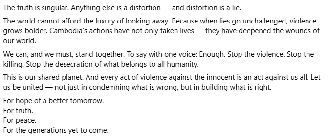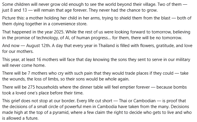 ทุกชีวิตที่ถูกพรากไป — ไทยหรือกัมพูชา — คือหลักฐานว่าการตัดสินใจของคนเพียงไม่กี่คนบนยอดอำนาจ ได้ทำลายอนาคตของผู้คนนับร้อยนับพัน