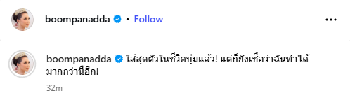 และ “บุ๋ม” ได้โพสต์รูปภาพของตัวเองพร้อมระบุข้อความว่า “ใส่สุดตัวในชีวิตบุ๋มแล้ว! แต่ก็ยังเชื่อว่าฉันทำได้มากกว่านี้อีก!” ซึ่งทางด้านชาวเน็ตได้เข้ามาแสดงความคิดเห็นให้กำลังใจอย่างมากมาย