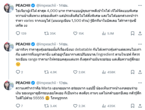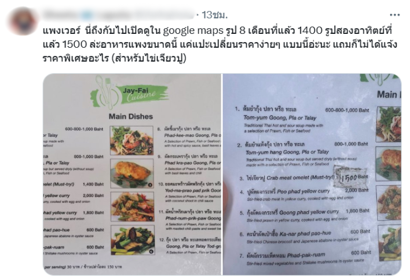 เรียกได้ว่ากำลังเป็นประเด็นร้อนบน X (Twitter) อย่างมากเมื่อ “พีชชี่” อินฟลูเอนเซอร์ชาวไทยที่อาศัยอยู่ที่ลอนดอนได้กลับมาประเทศไทยและไปร้านอาหารชื่อดัง สั่งเมนูยอดนิยมมาแต่กลับกลายเป็นอีกราคาที่ไม่ตรงตามในเมนู ซึ่ง “พีชชี่” ได้โพสต์ข้อความว่า “ไข่เจียวปูเจ๊ไฝ ล่าสุด 4,000 บาท ราคาแบบปูคุณภาพดีเข้าใจได้ เจ๊ไฝจัดแบบพิเศษหวานฉ่ำเต็มพวง อร่อยเต็มคำ แต่ประเด็นคือไม่ได้สั่งพิเศษ และไม่ได้บอกล่วงหน้าว่าราคา varies จากเมนูได้ (บนเมนูเขียน 1,500 ถ้วน) รู้อีกทีมาในบิลเลย ได้ราคาจุ่มซีเคร็ต งง”