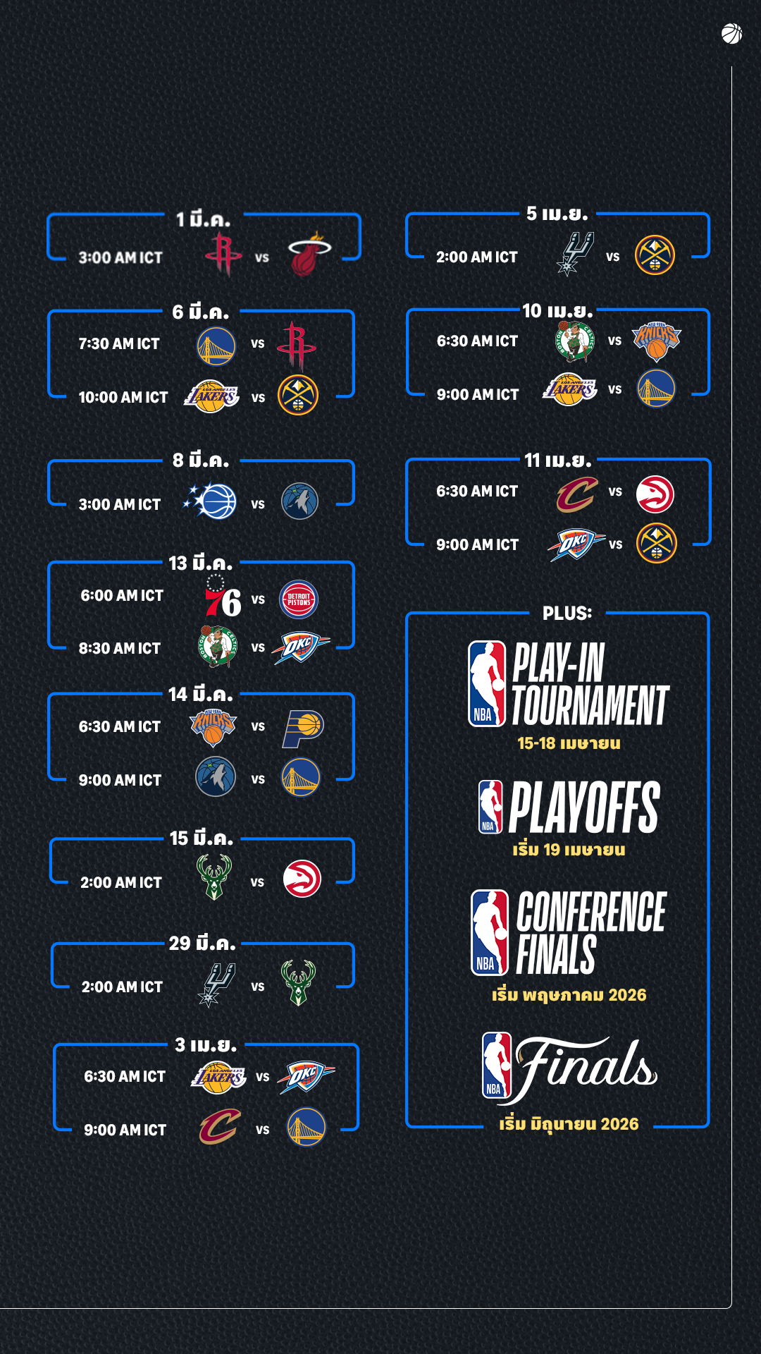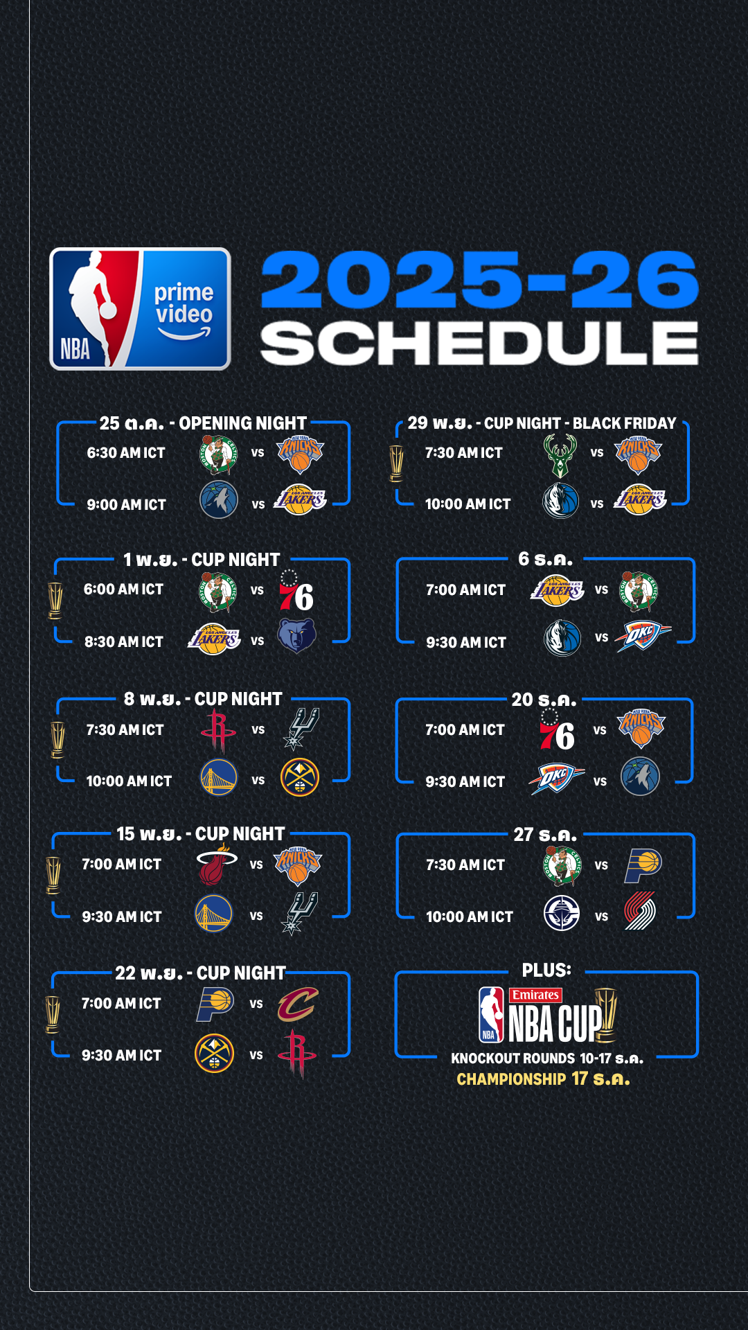 ตารางถ่ายทอดสด NBA on Prime Video ฤดูกาล 2025-2026 (ตามเวลาประเทศไทย)