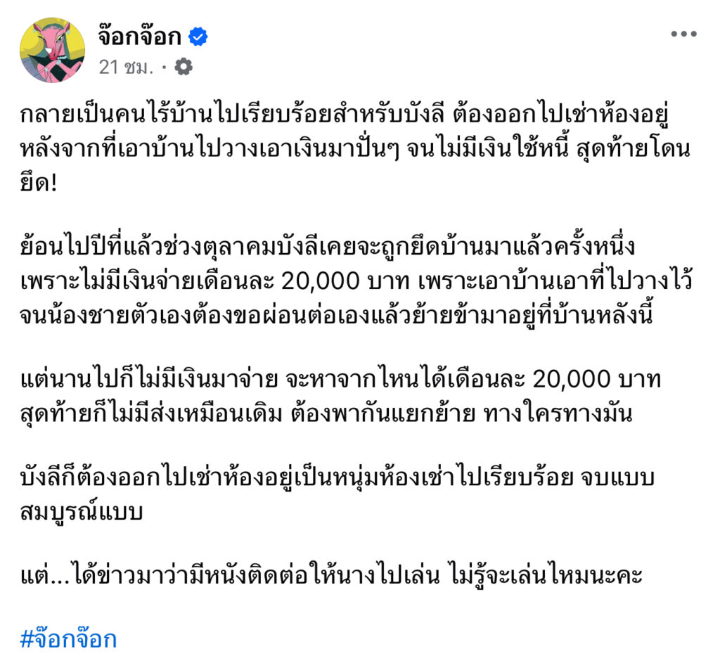 ”กลายเป็นคนไร้บ้านไปเรียบร้อยสำหรับบังลี ต้องออกไปเช่าห้องอยู่ หลังจากที่เอาบ้านไปวางเอาเงินมาปั่นๆ จนไม่มีเงินใช้หนี้ สุดท้ายโดนยึด!
