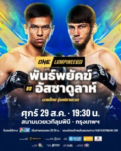 เผยโฉมคู่เอกของศึก ONE ลุมพินี 122 ในวันศุกร์ที่ 29 ส.ค. นี้ “ยอดมวย 3 พ.ศ.” พันธ์พยัคฆ์ จิตรเมืองนนท์ นักชกเชิงสูงจากสมุทรปราการ เตรียมทดสอบฟอร์มร้อนแรงของ “อัสซาดูลาห์ อิมานกาซาลิเอฟ” นักสู้ไร้พ่ายจากรัสเซีย ภายใต้กติกามวยไทย รุ่นฟลายเวต (125–135 ป.)