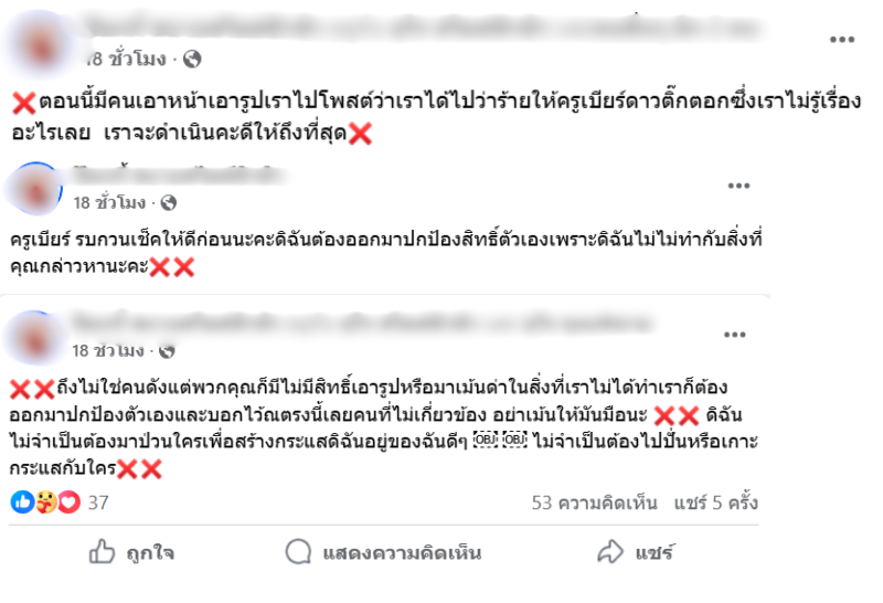 “ครูเบียร์ รบกวนเช็คให้ดีก่อนนะคะดิฉันต้องออกมาปกป้องสิทธิ์ตัวเองเพราะดิฉันไม่ไม่ทำกับสิ่งที่คุณกล่าวหานะคะ”