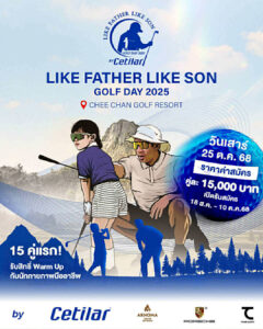 Like Father, Like Son Golf Day 2025 by Cetilar เปิดรับสมัครตั้งแต่วันนี้ – 10 ตุลาคม 2568 ค่าสมัคร เพียง 15,000 บาท/คู่ รวมกรีนฟี แคดดี้ รถกอล์ฟ ของที่ระลึก ( เสื้อ / ร่ม ) และดินเบอร์บุฟเฟต์นานาชาติ และสำหรับ 15 คู่แรกที่ลงสมัคร จะได้รับสิทธิพิเศษ จาก Cetilar ที่จะสอนเตรียมร่างกายก่อนออกรอบโดยนักกายภาพบำบัดวิชาชีพด้านกีฬามืออาชีพ
