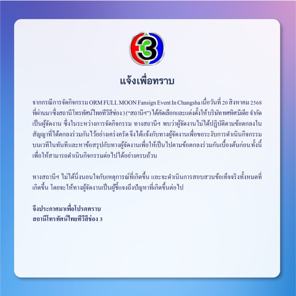 ล่าสุดฝั่งต้นสังกัดของ “ออม” ได้ออกแถลงการณ์ว่า “จากกรณีการจัดกิจกรรม ORM FULL MOON Fansign Event In Changsha เมื่อวันที่ 20 สิงหาคม 2568 ที่ผ่านมาซึ่งสถานีโทรทัศน์ไทยทีวีสีสีช่อง3(“สถานีฯ”) ได้คัดเลือกและแต่งตั้งให้บริษัท ทศทิศมีเดีย จำกัด เป็นผู้จัดงาน ซึ่งในระหว่างการจัดกิจกรรม ทางสถานีฯ พบว่าผู้จัดงานไม่ได้ปฏิบัติตามข้อตกลงในสัญญาที่ได้ตกลงร่วมกันไว้อย่างเคร่งครัด จึงได้แจ้งกับทางผู้จัดงานเพื่อขอระงับการดำเนินกิจกรรมบนเวทีในทันทีและหาข้อสรุปกับทางผู้จัดงานเพื่อให้เป็นไปตามข้อตกลงร่วมกันเบื้องต้นก่อน ทั้งนี้เพื่อให้สามารถคำเนินกิจกรรมต่อไปได้อย่างครบถ้วน ทางสถานีฯ ไม่ได้นิ่งนอนใจกับเหตุการณ์ที่เกิดขึ้น และจะดำเนินการสอบสวนข้อเท็จจริงทั้งหมดที่ เกิดขึ้น โดยจะให้ทางผู้จัดงานเป็นผู้ชี้แจงถึงปัญหาที่เกิดขึ้นต่อไป”