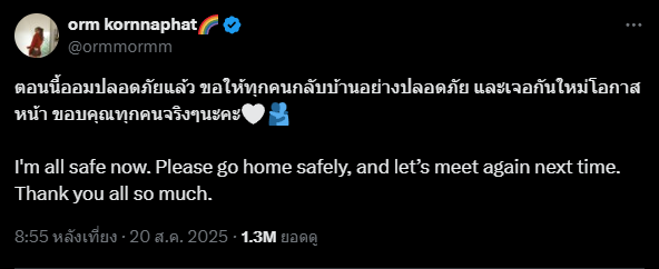 หลังจากเหตุการณ์ดังกล่าว “ออม” ได้มาโพสต์ข้อความผ่า X (Twitter) ว่า “ตอนนี้ออมปลอดภัยแล้ว ขอให้ทุกคนกลับบ้านอย่างปลอดภัย และเจอกันใหม่โอกาสหน้า ขอบคุณทุกคนจริงๆนะคะ