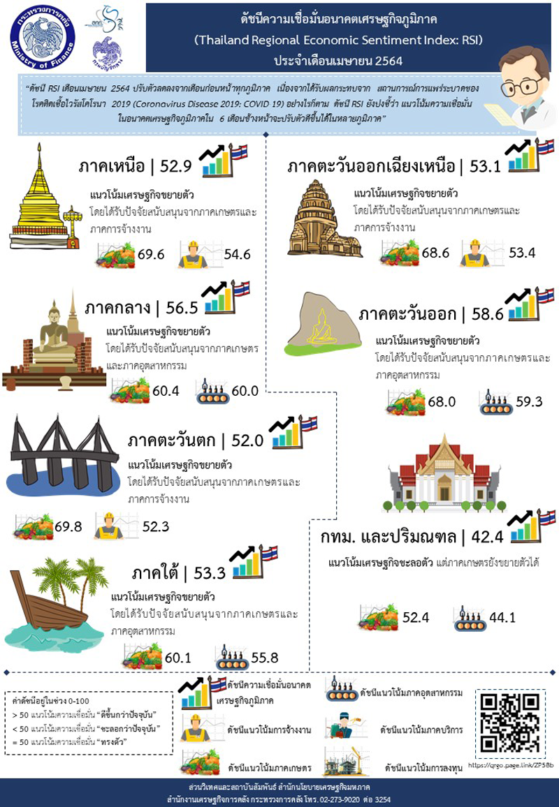 นางสาวกุลยา ตันติเตมิท ผู้อำนวยการสำนักงานเศรษฐกิจการคลัง ในฐานะโฆษกกระทรวงการคลัง เปิดเผยรายงานดัชนีความเชื่อมั่นอนาคตเศรษฐกิจภูมิภาคประจำเดือนเมษายน 2564 จากการประมวลผลข้อมูลการสำรวจภาวะเศรษฐกิจรายจังหวัดจากสำนักงานคลังจังหวัด 76 จังหวัดทั่วประเทศ สภาอุตสาหกรรมแห่งประเทศไทย และสภาหอการค้าแห่งประเทศไทย เพื่อจัดทำดัชนีความเชื่อมั่นอนาคตเศรษฐกิจภูมิภาค พบว่า ดัชนี RSI เดือนเมษายน 2564 ปรับตัวลดลงจากเดือนก่อนหน้าทุกภูมิภาค เนื่องจากได้รับผลกระทบจากสถานการณ์การแพร่ระบาดของโรคติดเชื้อไวรัสโคโรนา 2019