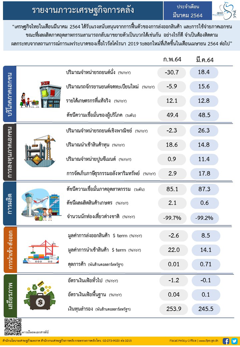 คลัง เผย เศรษฐกิจไทยในเดือนมีนาคม 2564 ได้รับแรงหนุนจากส่งออกฟื้น, การใช้จ่ายภาคเอกชน จับตาโควิดรอบใหม่ ขณะทุนสำรองมีสูง