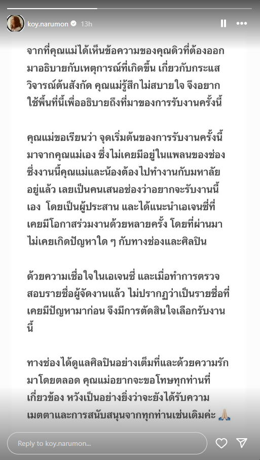 ด้วยความเชื่อใจในเอเจนซี่ และเมื่อทำการตรวจสอบรายชื่อผู้จัดงานแล้ว ไม่ปรากฏว่าเป็นรายชื่อที่เคยมีปัญหามาก่อน จึงมีการตัดสินใจเลือกรับงาน ทางช่องได้ดูแลศิลปินอย่างเต็มที่และด้วยความรักมาโดยตลอด คุณแม่อยากจะขอโทษทุกท่านที่เกี่ยวข้อง หวังเป็นอย่างยิ่งว่าจะยังได้รับความเมตตาและการสนับสนุนจากทุกท่านเช่นเดิมค่ะ”