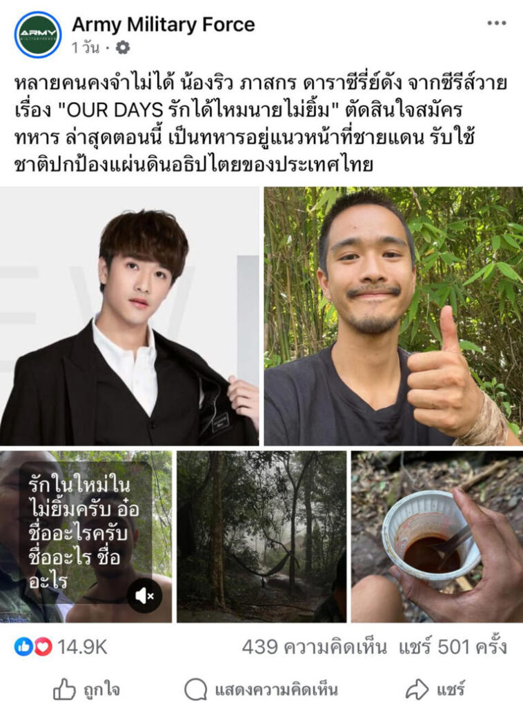 โดยเพจ Army Military Force ได้โพสต์รูปภาพของ “ริว” อีกทั้งคลิปของเจ้าตัวขณะประจำการพร้อมระบุข้อความว่า “หลายคนคงจำไม่ได้ น้องริว ภาสกร ดาราซีรี่ย์ดัง จากซีรีส์วายเรื่อง “OUR DAYS รักได้ไหมนายไม่ยิ้ม” ตัดสินใจสมัครทหาร ล่าสุดตอนนี้ เป็นทหารอยู่แนวหน้าที่ชายแดน รับใช้ชาติปกป้องแผ่นดินอธิปไตยของประเทศไทย ‎”
