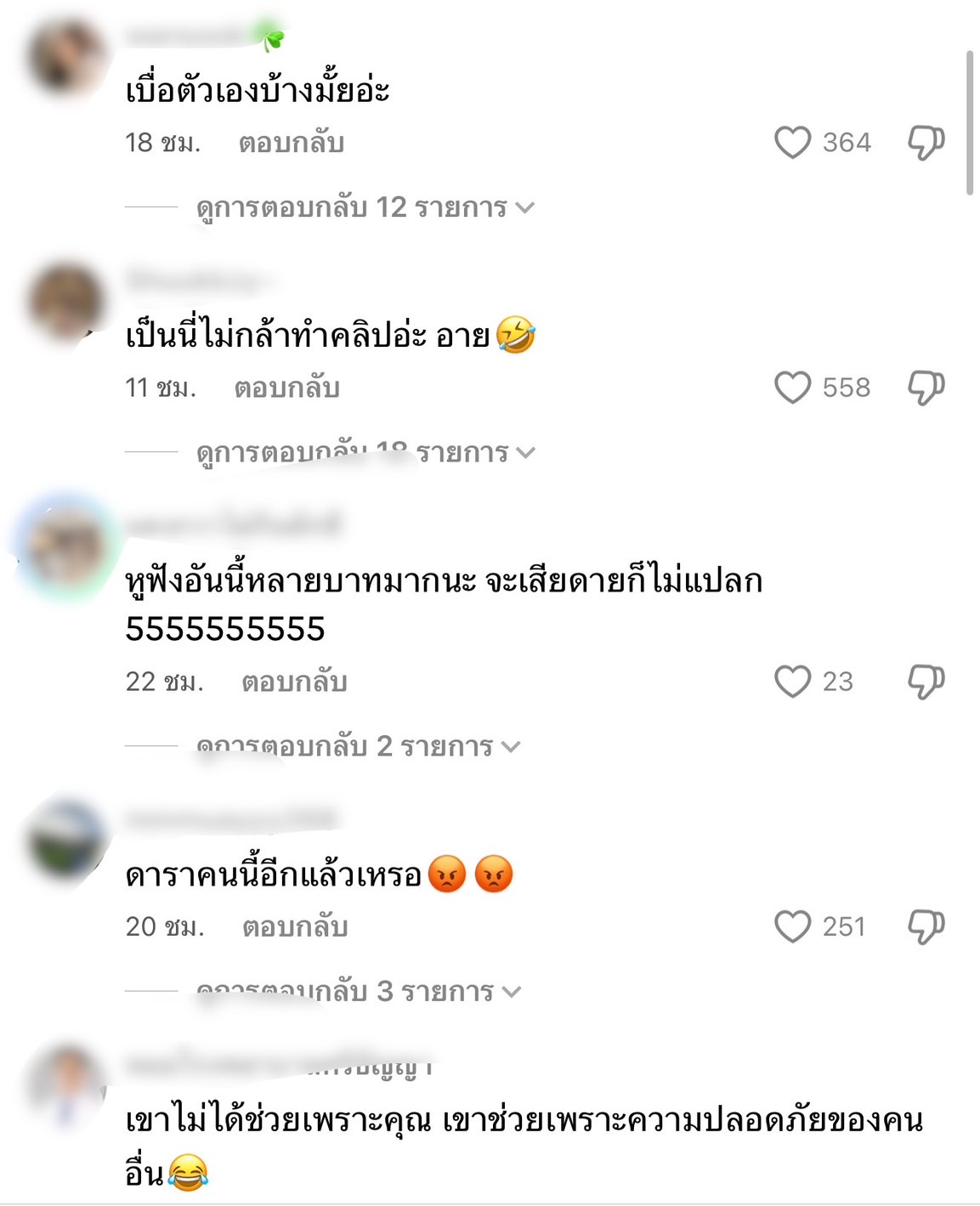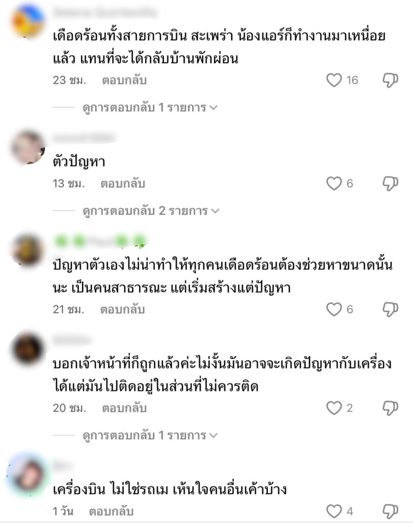 ท่ามกลางชาวเน็ตเข้ามาคอมเม้นต์ชื่นชมเจ้าหน้าที่พนักงาน แต่ไม่วายก็เจอชาวเน็ตบางกลุ่มเข้ามาคอมเม้นต์แซะแรงถึงดาราสาวทำนองว่า “มีแต่ปัญหา , เห็นทำของหายบ่อยยัง ไม่ใช่แกล้งทำหายนะ 😅 , เดือดร้อนทั้งสายการบิน สะเพร่า น้องแอร์ก็ทำงานมาเหนื่อยแล้ว แทนที่จะได้กลับบ้านพักผ่อน , บอกเจ้าหน้าที่ก็ถูกแล้วค่ะไม่งั้นมันอาจจะเกิดปัญหากับเครื่องได้แต่มันไปติดอยู่ในส่วนที่ไม่ควรติด , เครื่องบิน ไม่ใช่รถเม เห้นใจคนอื่นเค้าบ้าง , ขยันทำเรื่องให้คนอื่นเดือดร้อน , เบื่อตัวเองบ้างมั้ยอ่ะ , เขาไม่ได้ช่วยเพราะคุณ เขาช่วยเพราะความปลอดภัยของคนอื่น😂”