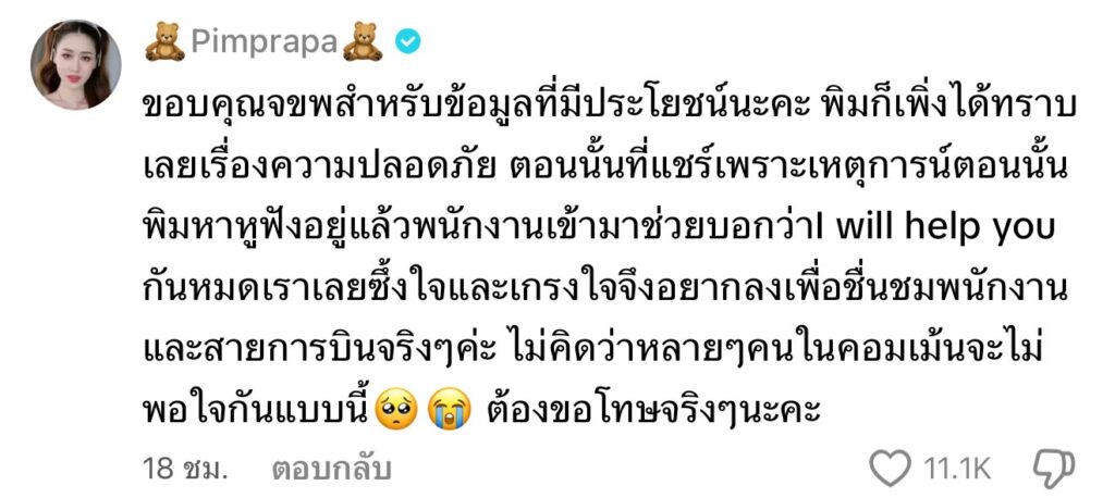 ทั้งนี้“พิม” ยังเข้าไปคอมเมนต์ช่องหนึ่งที่ออกมาชี้แจงว่าสาเหตุที่ต้องค้นหาหูฟังไร้สายให้เจอ เพราะมันคือความปลอดภัย เนื่องจากมันอาจจะเสียดสีและเกิดประกายไฟได้ โดย“พิม”คอมเมนต์ว่า “ขอบคุณจขพ สำหรับข้อมูลที่มีประโยชน์นะคะ พิมก็เพิ่งได้ทราบเลยเรื่องความปลอดภัย ตอนนั้นที่แชร์เพราะเหตุการน์ตอนนั้นพิมหาหูฟังอยู่แล้วพนักงานเข้ามาช่วยบอกว่าI will help you กันหมดเราเลยซึ้งใจและเกรงใจจึงอยากลงเพื่อชื่นชมพนักงานและสายการบินจริงๆค่ะ ไม่คิดว่าหลายๆคนในคอมเม้นจะไม่พอใจกันแบบนี้🥺😭 ต้องขอโทษจริงๆนะคะ”