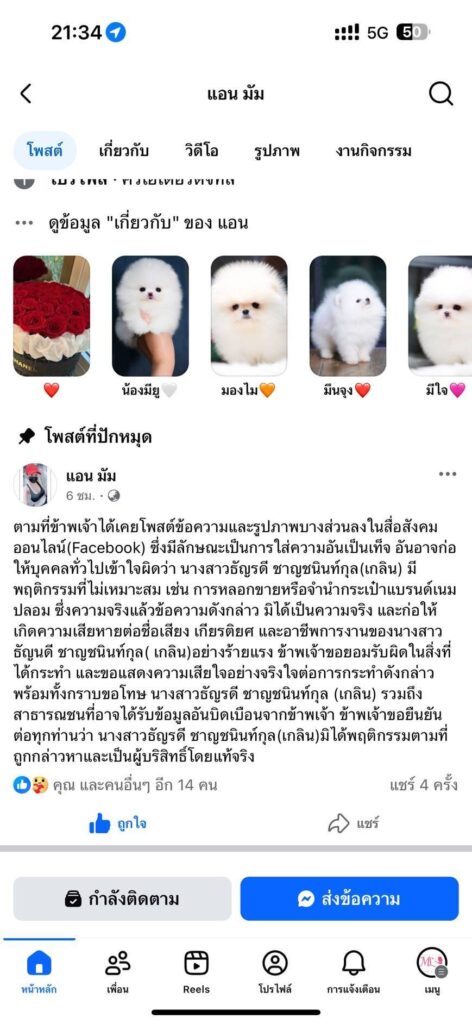 ตามที่ตลอดระยะเวลากว่า 1 ปีที่ผ่านมา นางสาวธัญรดี ชาญชนินท์กุล หรือ เกลิน ธัญรดี นักแสดง ได้ถูกใส่ร้ายและเผยแพร่ข้อความอันเป็นเท็จในสื่อสังคมออนไลน์ จนส่งผลกระทบต่อชื่อเสียง เกียรติยศ และภาพลักษณ์ทางอาชีพ