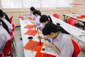 หนึ่งในไฮไลต์ของค่ายครั้งนี้คือการสัมผัสวัฒนธรรมจีนอย่างใกล้ชิด ภายใต้การดูแลของอาจารย์ผู้เชี่ยวชาญจากสถาบันขงจื่อเส้นทางสายไหมทางทะเล DPU นักเรียนได้เรียนรู้การเขียนพู่กันจีน ฝึกขีดเขียนตัวอักษรจีนโบราณอย่างประณีต พร้อมทำความเข้าใจความหมายเชิงสัญลักษณ์ของลายเส้นที่สะท้อนปรัชญาและความงามทางศิลปะจีนที่สืบทอดมายาวนาน รวมถึงการวาดหน้ากากงิ้ว ศิลปะที่เปี่ยมด้วยสีสันและความหมาย ทำให้นักเรียนเข้าใจว่าทุกสีบนหน้ากากไม่ได้เป็นเพียงความสวยงาม แต่ยังบ่งบอกถึงบุคลิกและอุปนิสัยของตัวละครในงิ้วจีน