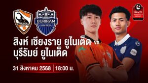 ส่วนอีกคู่หนึ่งที่นับเป็นบิ๊กแมตช์ประจำสัปดาห์ ก็คือ “กว่างโซ้งมหาภัย” สิงห์ เชียงราย ยูไนเต็ด ที่จะเปิดสิงห์ เชียงราย สเตเดียม รับการมาเยือนของแชมป์เก่าและจ่าฝูงในเวลานี้อย่าง “ปราสาทสายฟ้า” บุรีรัมย์ ยูไนเต็ด แข่งขันในวันอาทิตย์ที่ 31 สิงหาคม เวลาดี 18.00 น. ถ่ายทอดสดทาง PLAY SPORTS2