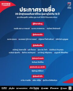 สมาคมกีฬาฟุตบอลแห่งประเทศไทย ในพระบรมราชูปถัมภ์ โดย “บิ๊กป๋อม” อดิศักดิ์ เบ็ญจศิริวรรณ อุปนายกสมาคมกีฬาฟุตบอลฯ ฝ่ายพัฒนาฟุตซอลและฟุตบอลชายหาดฯ ประกาศรายชื่อ 20 นักฟุตซอลที่ผ่านการคัดตัวกับทีมฟุตซอลทีมชาติไทย รุ่นอายุไม่เกิน 16 ปี ภายใต้การคุมทัพของ เอลอย อลอนโซ่ กุนซือใหญ่ และ “โค้ชตั้ม” ภัฏ ศรีวิจิตร เป็นผู้ช่วยผู้ฝึกสอน โดยมี “บอสปืน” บัญชา หุ่นไทย ทำหน้าที่ผู้จัดการทีม สำหรับการเตรียมสู้ศึก เอเชียน ยูธ เกมส์ 2025 ที่กรุงมานามา ประเทศบาห์เรน ระหว่างวันที่ 22-31 ตุลาคม 2568 โดยรายชื่อ 20 นักฟุตซอลที่ผ่านการคัดเลือกมีดังต่อไปนี้
