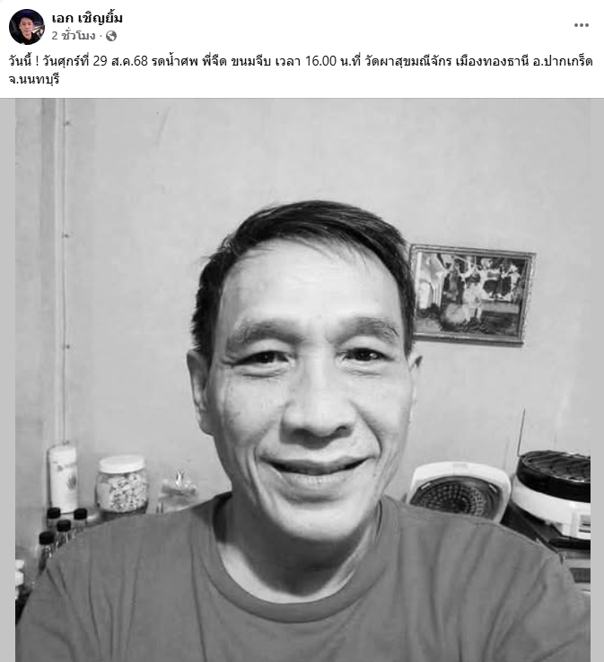 ล่าสุด “เอก เชิญยิ้ม” ได้แจ้งข่าวให้ทราบเพิ่มเติมว่า “วันนี้ ! วันศุกร์ที่ 29 ส.ค.68 รดน้ำศพ พี่จืด ขนมจีบ เวลา 16.00 น.ที่ วัดผาสุขมณีจักร เมืองทองธานี อ.ปากเกร็ด จ.นนทบุรี” ซึ่งทางด้านแฟนคลับก็ได้เข้ามาแสดงความเสียใจและไว้อาลัยกันอย่างมากมาย พร้อมทั้งขอให้ “จืด ขนมจีบ” ไปสู่ภพภูมิที่ดี