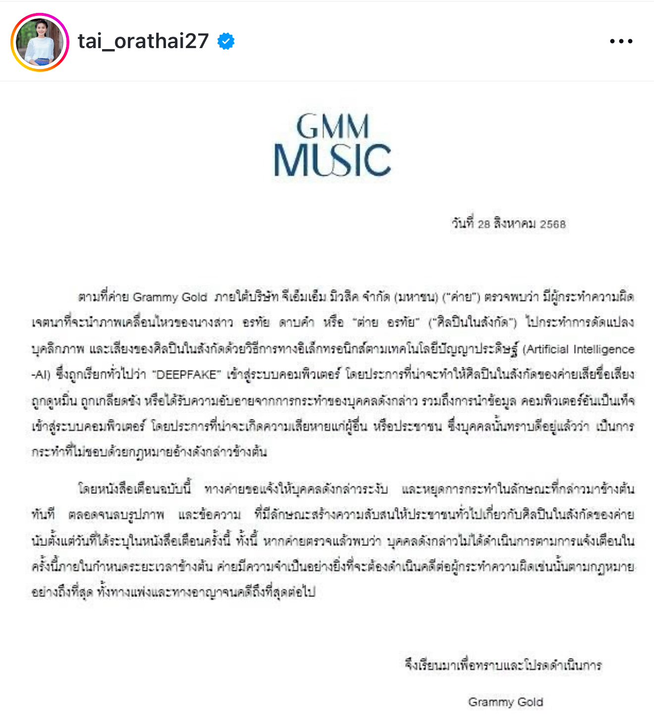ซึ่งทางด้าน “ต่าย อรทัย” ก็ได้ออกมาโพสต์จดหมายที่ทางค่ายร่อนประกาศพร้อมแคปชั่นว่า “ตามนี้นะคะ” โดยมีข้อความว่า “ตามที่ค่าย Grammy Gold ภายใต้บริษัท จีเอ็มเอ็ม มิวสิค จำกัด (มหาชน) (“ค่าย”) ตรวจพบว่า มีผู้กระทำความผิด เจตนาที่จะนำภาพเคลื่อนไหวของ นางสาว อรทัย ดาบคำ หรือ “ต่าย อรทัย” (‘ศิลปินในสังกัด‘) ไปกระทำการตัดแปลงบุคลิกภาพ และเสียงของศิลปินในสังกัด ด้วยวิธีการทางอิเล็กทรอนิกส์ตามเทคโนโลยีปัญญาประดิษฐ์