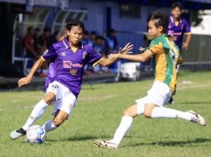 คู่ที่ 4 ภัทรวีร์ ดีบ้านโสก (เสื้อม่วง) นักเตะทีมกรุงเทพคริสเตียนวิทยาลัย แชมป์เก่า พยายามเลี้ยงบอลลุยฝ่า การขวางสกัดของ ผู้เล่นทีมเทพศิรินทร์ เชียงใหม่ ในการแข่งขันฟุตบอลกีฬาระหว่างโรงเรียน รุ่นอายุ 16 ปี ประเภท ก. “กรมพลศึกษา เดลินิวส์คัพ 2025” รอบแรก นัดแรก ที่สนาม ม.กรุงเทพธนบุรี ผล แชมป์เก่า ถล่มไป 5-1