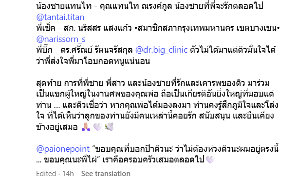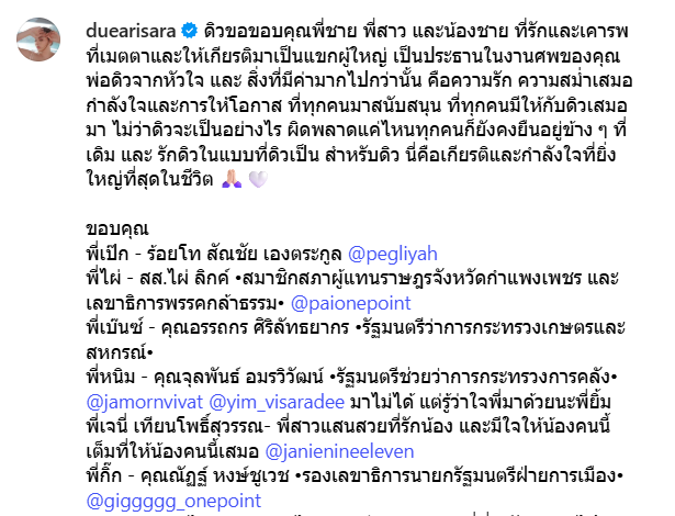 สุดท้าย การที่พี่ชาย พี่สาว และน้องชายที่รักและเคารพของดิว มาร่วมเป็นแขกผู้ใหญ่ในงานศพของคุณพ่อ ถือเป็นเกียรติอันยิ่งใหญ่ที่มอบแด่ท่าน … และดิวเชื่อว่า หากคุณพ่อได้มองลงมา ท่านคงรู้สึกภูมิใจและโล่งใจ ที่ได้เห็นว่าลูกของท่านยังมีคนเหล่านี้คอยรัก สนับสนุน และยืนเคียงข้างอยู่เสมอ 🙏🏻🤍🕊️”