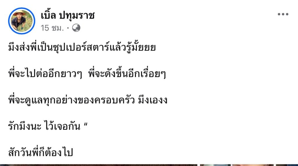 เรียกว่านับเป็นข่าวสูญเสียครั้งยิ่งใหญ่ สำหรับนักร้องหนุ่ม ”เบิ้ล ปทุมราช“ หลังเจ้าตัวออกมาประกาศสูญเสียน้องชายสาเหตุ โดนน้ำฝาซัดจม โดยทางด้าน “เบิ้ล” ได้ออกมาโพสต์ภาพคู่น้องชาย พร้อมแคปชั่นว่า “มึงส่งพี่เป็นซุปเปอร์สตาร์แล้วรู้มั้ยยย พี่จะไปต่ออีกยาวๆ พี่จะดังขึ้นอีกเรื่อยๆ พี่จะดูแลทุกอย่างของครอบครัว มึงเองง รักมึงนะ ไว้เจอกัน “ สักวันพี่ก็ต้องไป“
