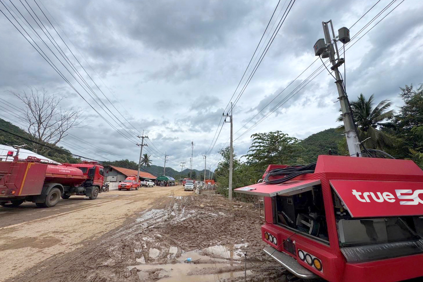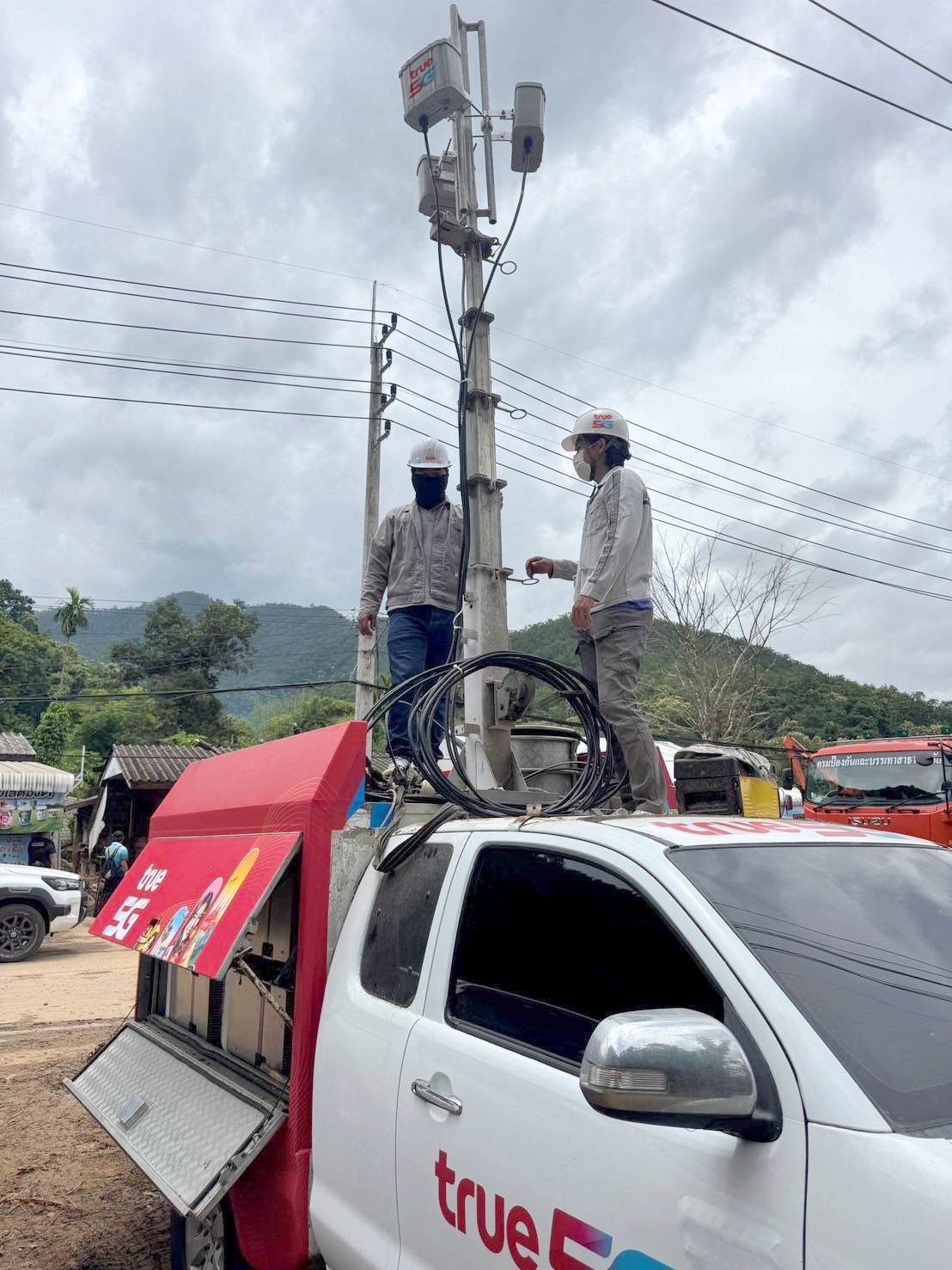 โดยการสื่อสารทั้งวอยซ์และดาต้ามีบทบาทสำคัญอย่างยิ่งต่อการประสานงานในช่วงวิกฤต ทรู คอร์ปอเรชั่นจึงส่งรถโมบายล์สถานีฐานเคลื่อนที่เร็ว หรือ COW พร้อมทีมวิศวกรเครือข่ายและทีมเน็ตเวิร์กลงพื้นที่บ้านผาบ่อง จังหวัดแม่ฮ่องสอน พร้อมตรวจสอบสถานีฐานและนำเครื่องปั่นไฟติดตั้งเสริมเพื่อให้การใช้งานเครือข่ายเป็นไปอย่างต่อเนื่อง แม้ในกรณีที่เกิดไฟฟ้าดับจากฝนตกหนัก เพื่อสนับสนุนการสื่อสารสำหรับการปฏิบัติงานของเจ้าหน้าที่จากทุกหน่วยงาน ทั้งฝ่ายเจ้าหน้าที่ภาครัฐ กองทัพ และองค์กรปกครองส่วนท้องถิ่น ที่ร่วมมือกันเข้าช่วยเหลือประชาชน เร่งซ่อมแซมที่อยู่อาศัยที่เสียหาย เก็บกวาดซากปรักหักพัง ตลอดจนฟื้นฟูพื้นที่ให้กลับมาใช้งานได้ตามปกติ