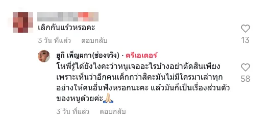 ซึ่งดูเหมือนความสัมพันธ์จะสะดุดเมื่อ “ยูกิ” ได้โพสต์คลิปตัวเองและเขียนข้อความว่า “เราไม่อินกับเธอว่ะ…” พร้อมระบุแคปชั่นว่า “อืมนะ55555” ซึ่งได้มีคนที่ติดตามเข้ามาคอมเมนต์ถามว่า “เลิกกันแล้วหรอคะ” ด้าน “ยูกิ” ก็ได้เข้ามาตอบว่า “โหพี่รู้ได้ยังไงคะ ว่าหนูเจออะไรบ้าง อย่าตัดสินเพียงเพราะเห็นว่าอีกคนเด็กกว่าสิคะ มันไม่มีใครมาเล่าทุกอย่างให้คนอื่นฟังหรอกนะคะ แล้วมันก็เป็นเรื่องส่วนตัวของหนูด้วยค่ะ”