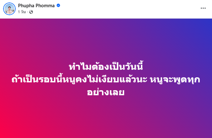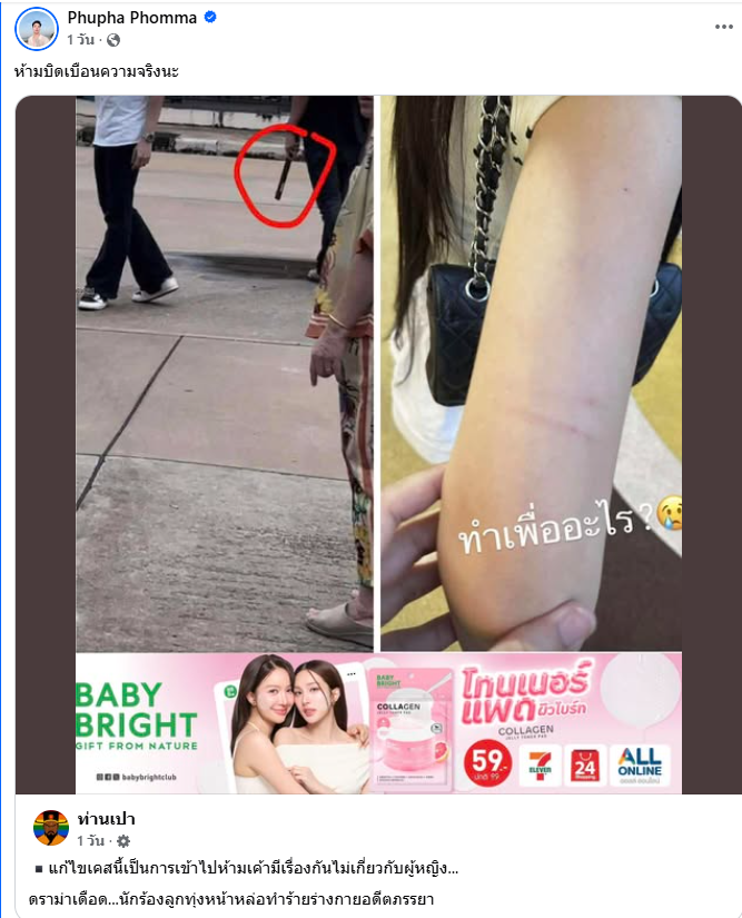 อีกทั้งยังได้แชร์โพสต์จากเพจท่านเปาที่มีรูปภาพแขนของผู้หญิงพร้อมระบุข้อความไว้ว่า “ดราม่าเดือด…นักร้องลูกทุ่งหน้าหล่อทำร้ายร่างกายอดีตภรรยา” และ “ภูผา” ได้เขียนข้อความเพิ่มเติมว่า “ห้ามบิดเบือนความจริงนะ”