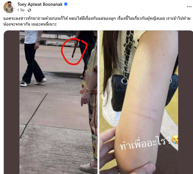 ต่อมาดูเหมือนว่าเรื่องจะยังไม่จบเมื่อ “ครูเต้ย” ได้โพสต์ภาพสตอรี่ของคนหนึ่งที่เป็นรูปแขนของผู้หญิงที่โดนทำร้าย พ้อตัดพ้อว่า “ลงแบบนี้เจตนาคืออะไรน๊าาา ใครคือต้นโพสต์น้อ ที่ทำให้คนเข้าใจผิดว่าต้วยตีแม่ของลูกหนิ ใจร้ายจัง”