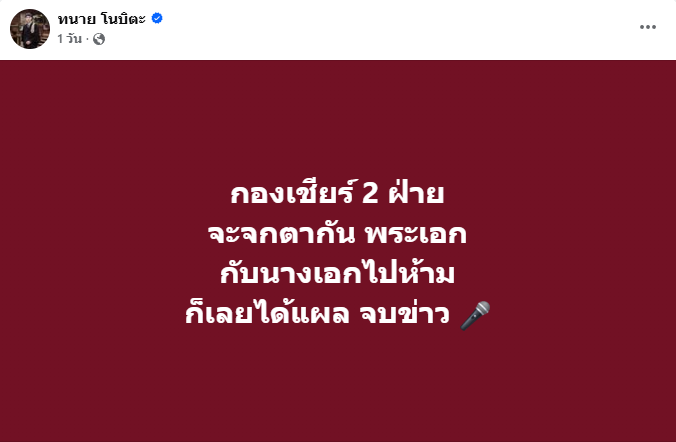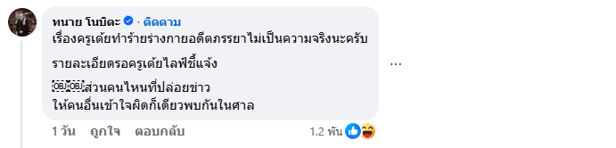 ทางด้าน “ทนายโนบิตะ” ทนายความของ “ครูเต้ย” ก็ได้แสดงความคิดเห็นว่า “เรื่องครูเต้ยทำร้ายร่างกายอดีตภรรยาไม่เป็นความจริงนะครับ รายละเอียดรอครูเต้ยไลฟ์ชี้แจ้ง ส่วนคนไหนที่ปล่อยข่าว ให้คนอื่นเข้าใจผิดก็เดียวพบกันในศาล” ทั้งยังออกมาโพสต์ อธิบายเพิ่มเติมว่า “กองเชียร์ 2 ฝ่าย จะจกตากัน พระเอก กับนางเอกไปห้าม ก็เลยได้แผล จบข่าว”