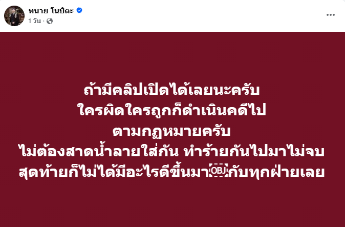 พร้อมทิ้งท้ายท้าทายว่า “ถ้ามีคลิปเปิดได้เลยนะครับ ใครผิดใครถูกก็ดำเนินคดีไป ตามกฎหมายครับ”