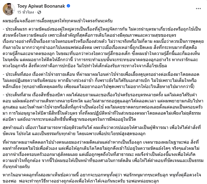 ที่ผ่านมาผมอาจติดตลกไปบ้างคนเลยมองว่าผมติดเล่นแต่ถ้าหากเป็นเรื่องลูก เจตนาของผมในฐานะพ่อ สิ่งที่ผมทำทั้งหมดไม่ใช่เพื่อตัวเอง แต่เพื่อให้ลูกเติบโตโดยไม่ถูกดึงเข้าไปอยู่ในความขัดแย้งใดๆ จริงๆแล้วผมไม่อยากนำเรื่องครอบครัวออกมาสู่สังคมเลย แต่เมื่อถูกพูดถึงในที่สาธารณะ ผมจึงจำเป็นต้องชี้แจงเพื่อให้เกิดความเข้าใจที่ถูกต้อง จากนี้ไปผมขอให้เป็นหน้าที่ของศาลในการตัดสิน เพื่อให้ได้คำตอบที่ชัดเจนและเป็นธรรมกับทุกฝ่ายครับ