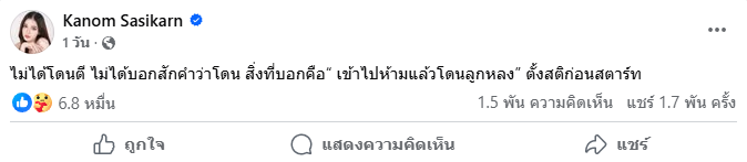 ขณะเดียวกัน “ขนม” ก็ได้ออกมาชี้แจงในฝั่งของตนว่า “ไม่ได้โดนตี ไม่ได้บอกสักคำว่าโดน สิ่งที่บอกคือ“ เข้าไปห้ามแล้วโดนลูกหลง” ตั้งสติก่อนสตาร์ท”