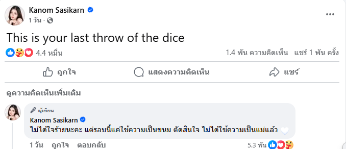 ทางด้าน “ขนม” ก็ได้โพสต์ข้อความอีกว่า “This is your last throw of the dice (นี่คือโอกาสครั้งสุดท้ายของคุณที่จะเสี่ยง)”