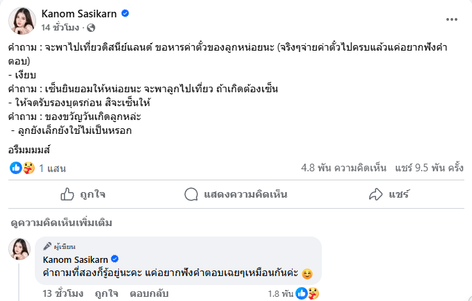ซึ่ง “ขนม” ยังคงโพสต์ต่ออีกว่า “คำถาม : จะพาไปเที่ยวดิสนีย์แลนด์ ขอหารค่าตั๋วของลูกหน่อยนะ (จริงๆจ่ายค่าตั๋วไปครบแล้วแค่อยากฟังคำตอบ)