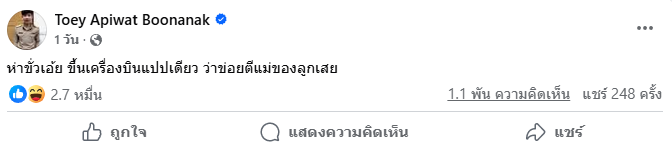 ทางด้าน “ครูเต้ย” จึงโพสต์ต่อว่า “ห่าขั่วเอ้ย ขึ้นเครื่องบินแปปเดียว ว่าข่อยตีแม่ของลูกเสย”