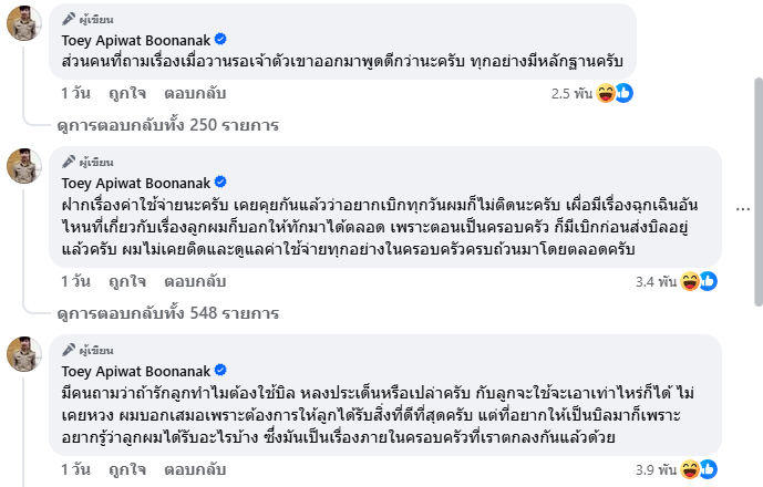 “มีคนถามว่าถ้ารักลูกทำไมต้องใช้บิล หลงประเด็นหรือเปล่าครับ กับลูกจะใช้จะเอาเท่าไหร่ก็ได้ ไม่เคยหวง ผมบอกเสมอเพราะต้องการให้ลูกได้รับสิ่งที่ดีที่สุดครับ แต่ที่อยากให้เป็นบิลมาก็เพราะอยากรู้ว่าลูกผมได้รับอะไรบ้าง ซึ่งมันเป็นเรื่องภายในครอบครัวที่เราตกลงกันแล้วด้วย”