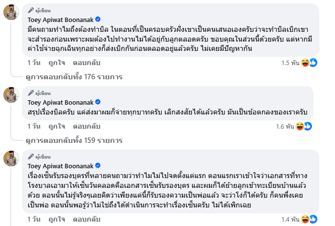 “เรื่องเซ็นรับรองบุตรที่หลายคนถามว่าทำไมไม่ไปจดตั้งแต่แรก ตอนแรกเราเข้าใจว่าเอกสารที่ทางโรงบาลเอามาให้เซ็นวันคลอดคือเอกสารเซ็นรับรองบุตร และผมก็ได้ย้ายลูกเข้าทะเบียนบ้านแล้วด้วย ตอนนั้นไม่รู้จริงๆเลยคิดว่าเพียงแค่นี้ก็รับรองความเป็นพ่อแล้ว จะว่าโง่ก็ได้ครับ ก็คนพึ่งเคยเป็นพ่อ ตอนนั้นพอรู้ว่าไม่ใช่ถึงได้ดำเนินการจะทำเรื่องเซ็นครับ ไม่ได้เพิกเฉย”