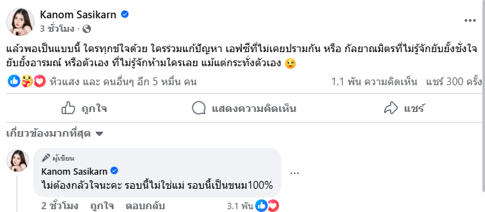 ล่าสุด (5 กันยายน 2568) “ขนม” ได้ออกมาโพสต์เพิ่มเติมว่า “แล้วพอเป็นแบบนี้ ใครทุกข์ใจด้วย ใครร่วมแก้ปัญหา เอฟซีที่ไม่เคยปรามกัน หรือ กัลยาณมิตรที่ไม่รู้จักยับยั้งชั่งใจยับยั้งอารมณ์ หรือตัวเอง ที่ไม่รู้จักห้ามใครเลย แม้แต่กระทั่งตัวเอง” และคอมเมนต์ใต้โพสต์ว่า “ไม่ต้องกลัวใจนะคะ รอบนี้ไม่ใช่แม่ รอบนี้เป็นขนม100%”