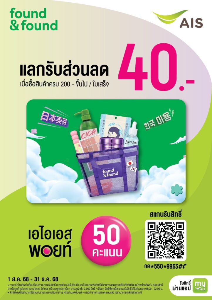 รับสิทธิ์ง่าย ๆ ผ่านแอป myAIS เพียง สแกน QR Code ณ จุดขาย หรือกด 5509963# โทรออก เพื่อรับสิทธิ์ แลกแล้วใช้ได้ทันที แคมเปญนี้พิเศษเฉพาะลูกค้า AIS และ AIS FIBRE3 รายบุคคล โดยสามารถใช้ AIS Points 50 คะแนน แลกรับส่วนลด 40 บาท เมื่อซื้อสินค้าครบ 200 บาทขึ้นไป/ใบเสร็จ ที่ร้าน found & found ทุกสาขา (ยกเว้น Mitsukoshi และ Foodland) ตั้งแต่วันนี้ – 31 ธันวาคม 2568