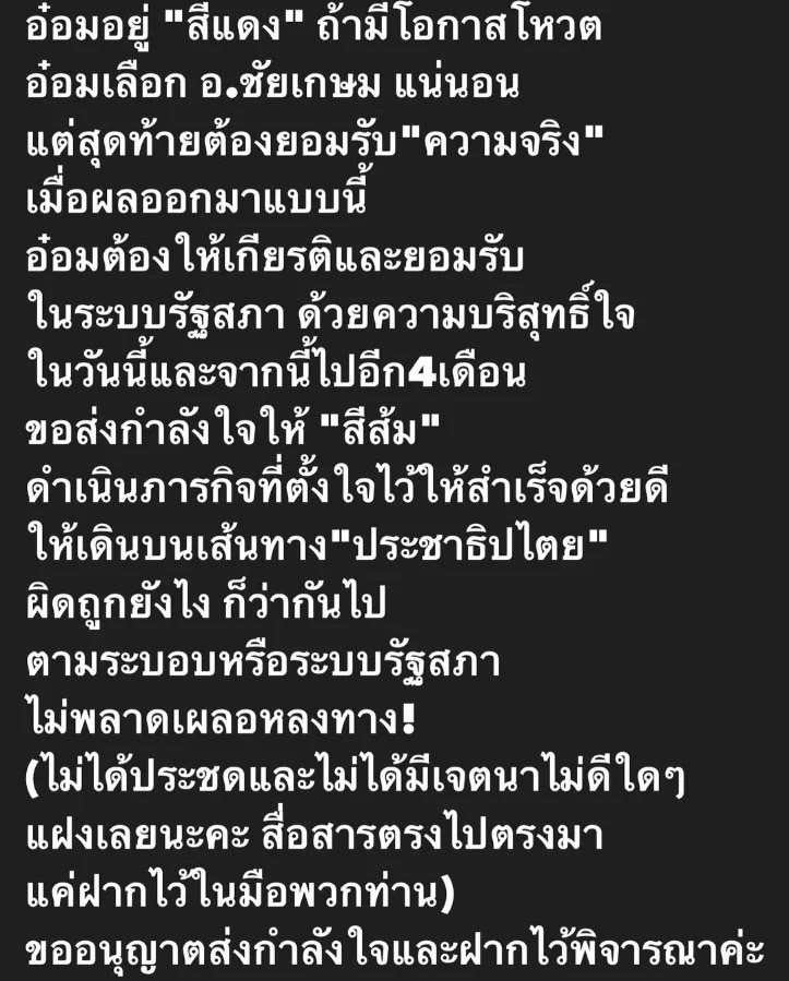 ล่าสุดทางด้านนักแสดงสาว “อ๋อม สกาวใจ” ได้ออกมาเคลื่อนไหวถึงประเด็นนี้เช่นกัน โดยโพสต์ข้อความที่เขียนว่า “อ๋อมอยู่ “สีแดง” ถ้ามีโอกาสโหวต อ๋อมเลือก อ.ชัยเกษม แน่นอน แต่สุดท้ายต้องยอมรับ “ความจริง” เมื่อผลออกมาแบบนี้ อ๋อมต้องให้เกียรติและยอมรับในระบบรัฐสภา ด้วยความบริสุทธิ์ใจ ในวันนี้และจากนี้ไปอีก 4 เดือน ขอส่งกำลังใจให้ “สีส้ม” ดำเนินภารกิจที่ตั้งใจไว้ให้สำเร็จด้วยดี ให้เดินบนเส้นทาง “ประชาธิปไตย” ผิดถูกยังไง ก็ว่ากันไป ตามระบอบหรือระบบรัฐสภา ไม่พลาดเผลอหลงทาง! (ไม่ได้ประชดและไม่ได้มีเจตนาไม่ดีใดๆ แฝงเลยนะคะ สื่อสารตรงไปตรงมาแค่ฝากไว้ในมือพวกท่าน) ขออนุญาตส่งกำลังใจและฝากไว้พิจารณาค่ะ”