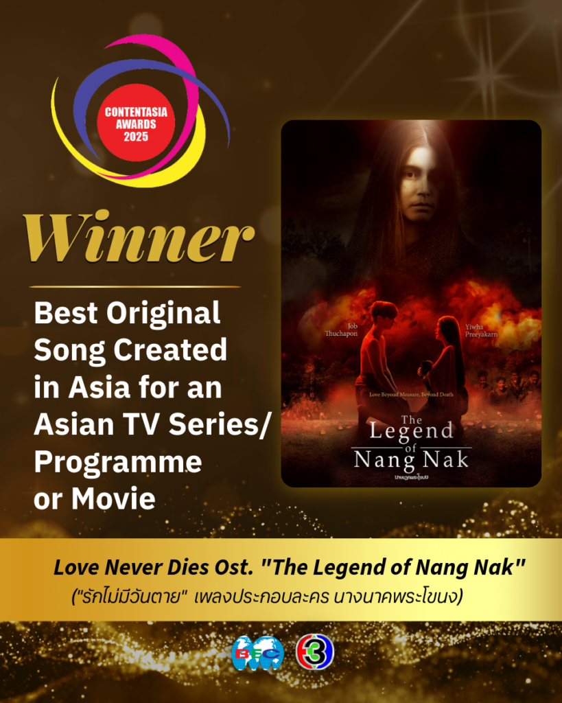 เริ่มกันที่รางวัล The Winner – Best Original Song Created in Asia for an Asian TV Series/Programme or Movie ที่ตกเป็นของเพลงประกอบละคร Love Never Dies (รักไม่มีวันตาย) จากเรื่อง นางนาคพระโขนง (The Legend of Nang Nak) บทพิสูจน์ว่าเพลงเพราะ ๆ มาพร้อมมิวสิกวิดีโอสวยซึ้งของละครคลาสสิกเรื่องนี้ยังคงตราตรึงใจคนดูได้ทั่วเอเชีย