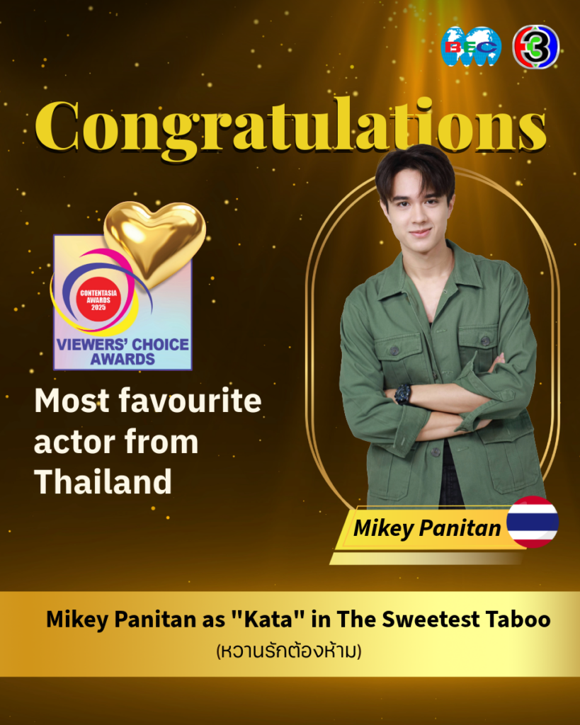 และปิดท้ายด้วยรางวัลขวัญใจมหาชน Viewers’ Choice Awards (Fan Favourite Actor from Thailand) ที่ตกเป็นของหนุ่มหล่อมากฝีมือ ไมกี้ ปณิธาน จากบท “คทา” ในละครสุดแซ่บ หวานรักต้องห้าม ที่เรียกเสียงกรี๊ดสนั่นโซเชียลมาแล้ว