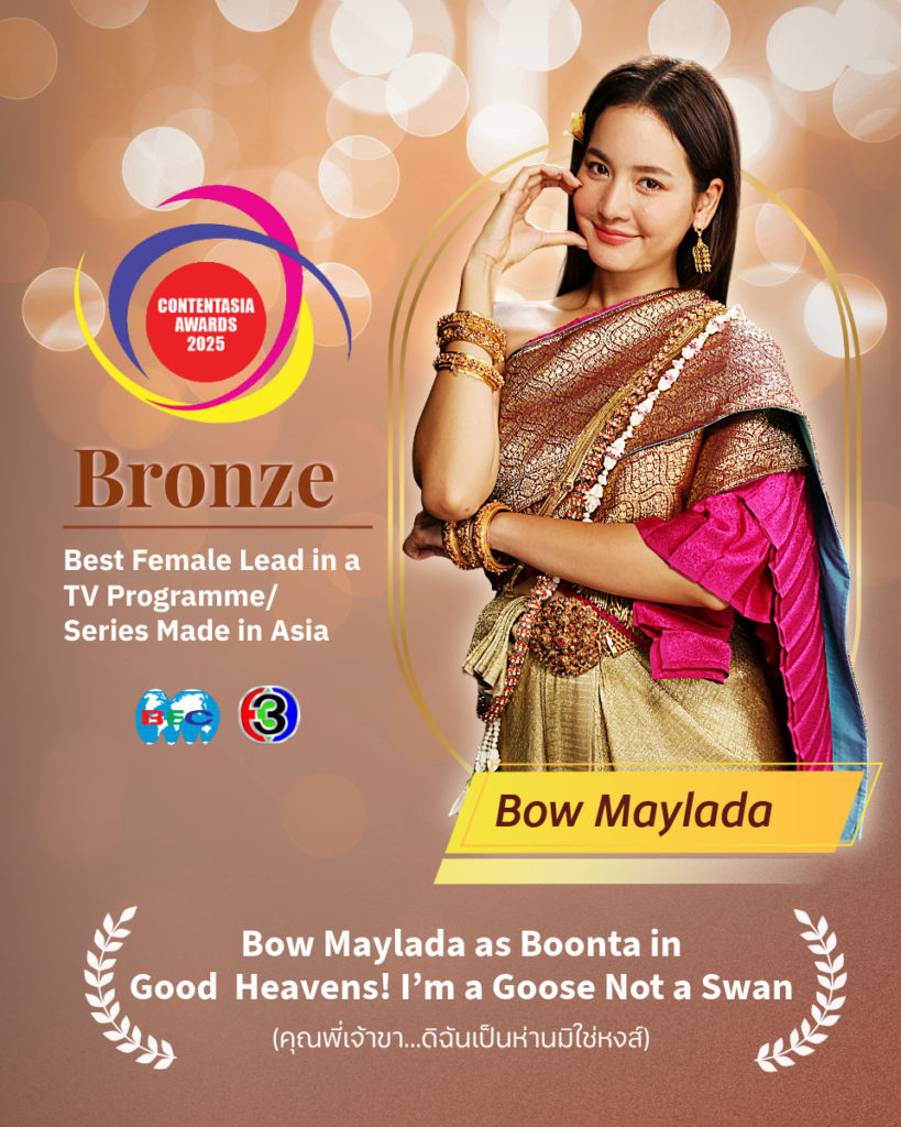 ต่อด้วยรางวัล Silver – Best Book-to-TV Adaptation Made in Asia จากละคร คุณพี่เจ้าขา…ดิฉันเป็นห่านมิใช่หงส์ (Good Heavens! I’m a Goose Not a Swan) ที่แค่ชื่อเรื่องก็สะดุดตาแล้ว เนื้อหายังปังจนเข้าตากรรมการแบบไม่ต้องสงสัย ไม่หมดแค่นั้น! ช่อง 3 ยังคว้า Bronze มาอีก 2 สาขา ได้แก่