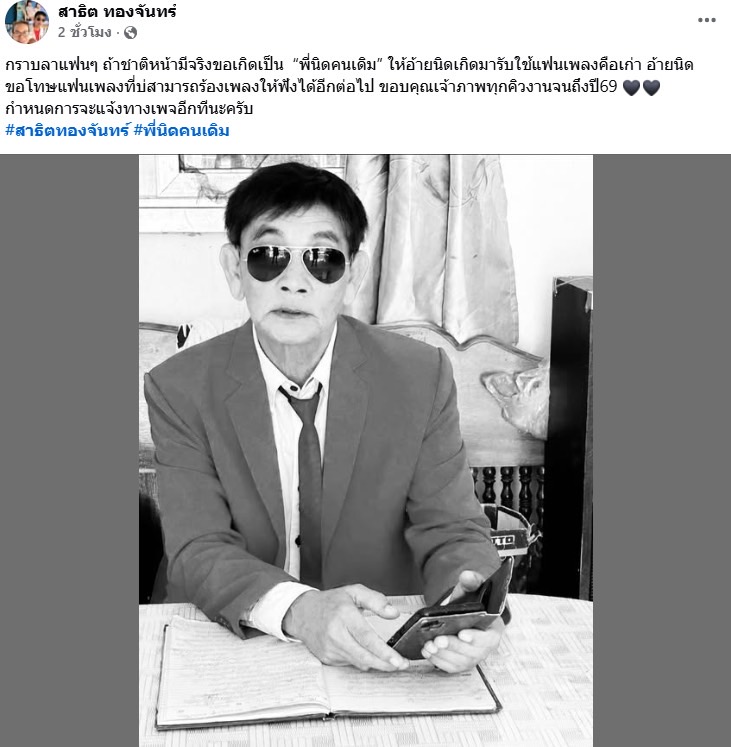 ซึ่งทางด้านเพจ “สาธิต ทองจันทร์” ได้ออกมาโพสต์ภาพ พร้อมแคปชั่นว่า ”กราบลาแฟนๆ ถ้าชาติหน้ามีจริงขอเกิดเป็น ‘พี่นิดคนเดิม’ ให้อ้ายนิดเกิดมารับใช้แฟนเพลงคือเก่า อ้ายนิดขอโทษแฟนเพลงที่บ่สามารถร้องเพลงให้ฟังได้อีกต่อไป ขอบคุณเจ้าภาพทุกคิวงานจนถึงปี 69 🖤🖤“ ท่ามกลางแฟนเพลงเข้ามาร่วมไว้อาลัยเป็นจำนวนมาก