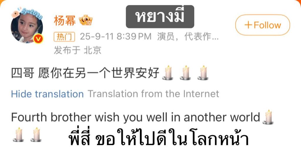 หลังจากได้รับการยืนยันว่า “อวี๋เมิ่งหลง“ เสียชีวิต ทางด้านเพื่อนนักแสดงก็ได้มาโพสต์ร่วแสดงความไว้อาลัยกันอย่างมากมาย อาทิ “หยางมี่, จู้ซวี่ตัน, ตีลี่เร่อเปา, จางเทียนอ้าย, สิงเฟย” และอีกมากมาย