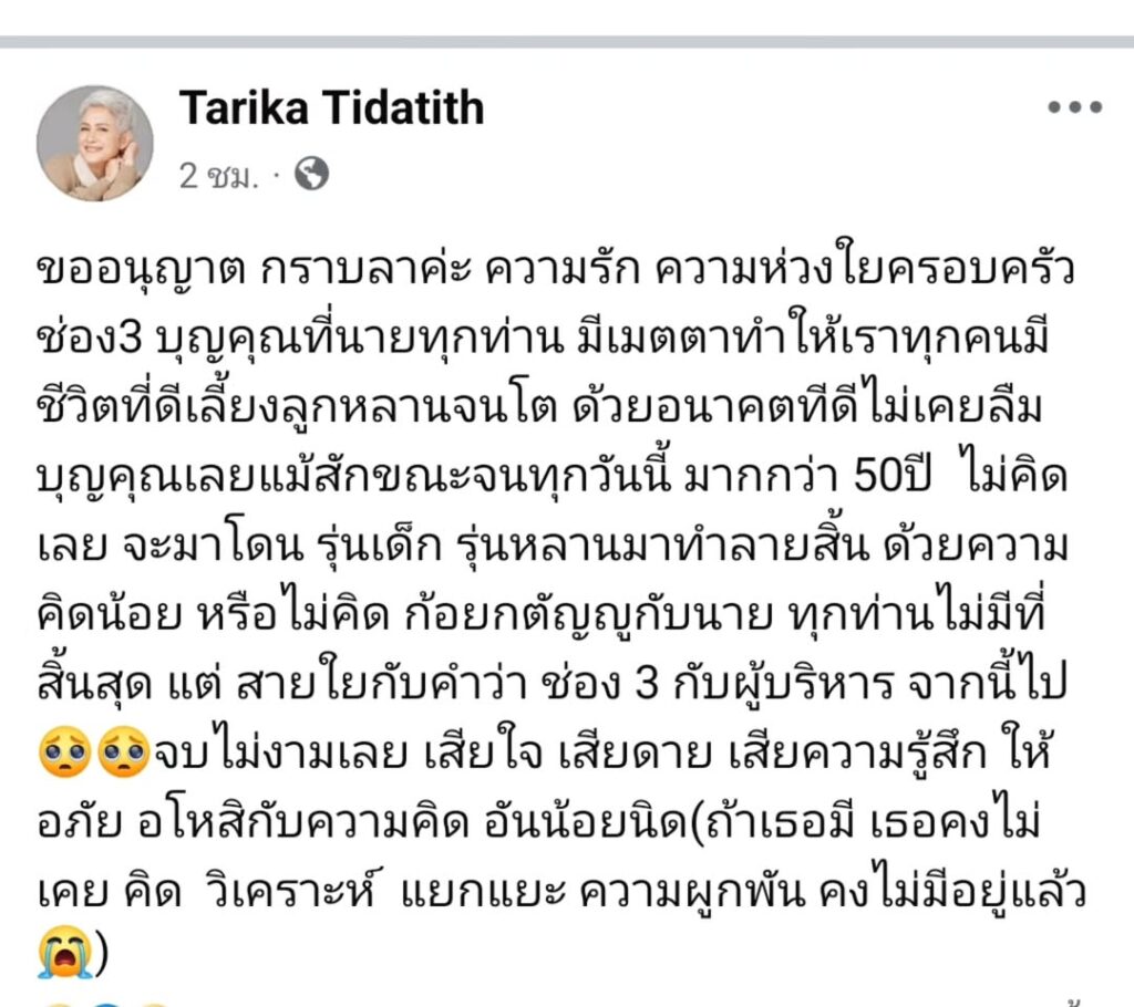 ก้อยกตัญญูกับนาย ทุกท่านไม่มีที่สิ้นสุด แต่ สายใยกับคำว่า ช่อง 3 กับผู้บริหาร จากนี้ไป 🥺🥺จบไม่งามเลย เสียใจ เสียดาย เสียความรู้สึก ให้อภัย อโหสิกับความคิด อันน้อยนิด(ถ้าเธอมี เธอคงไม่เคย คิด วิเคราะห์ แยกแยะ ความผูกพัน คงไม่มีอยู่แล้ว😭)”